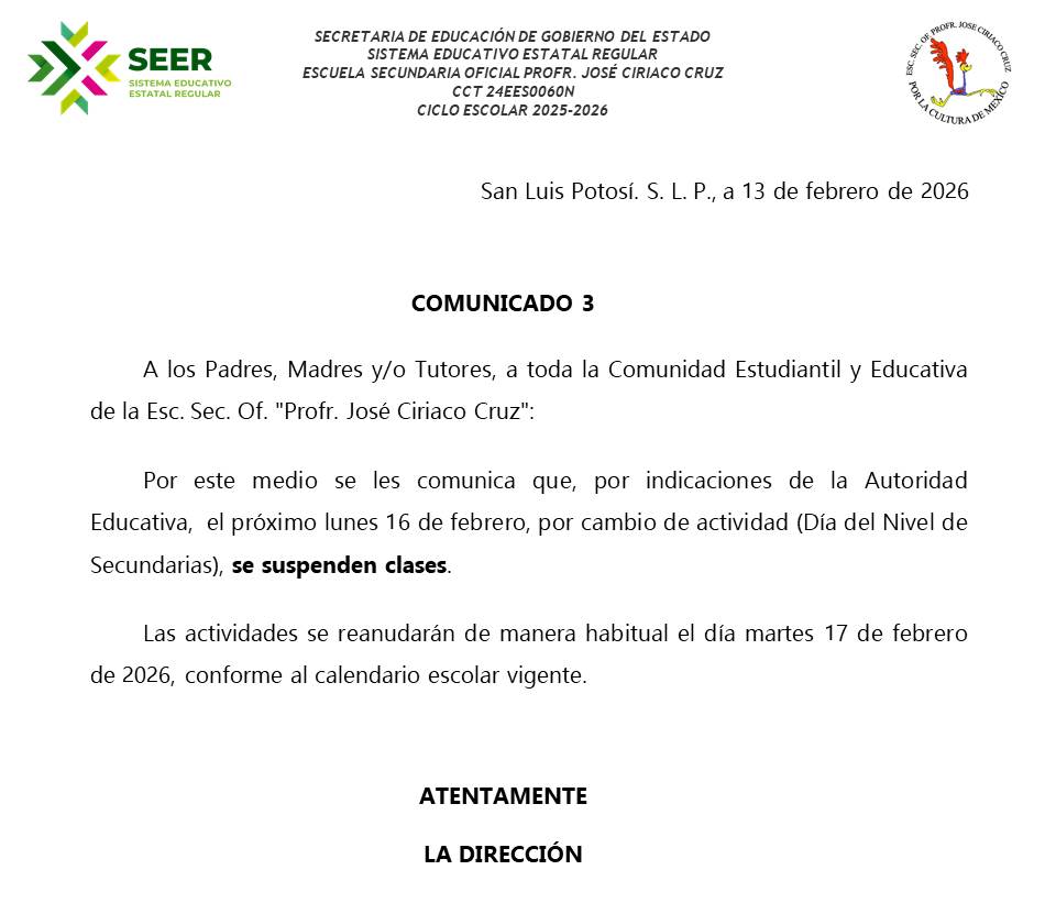 SECRETARIA DE EDUCACIÓN DE GOBIERNO DEL ESTADOSISTEMA EDUCATIVO ESTATAL REGULARESCUELA SECUNDARIA OFICIAL PROFR. JOSÉ CIRIACO CRUZ |
